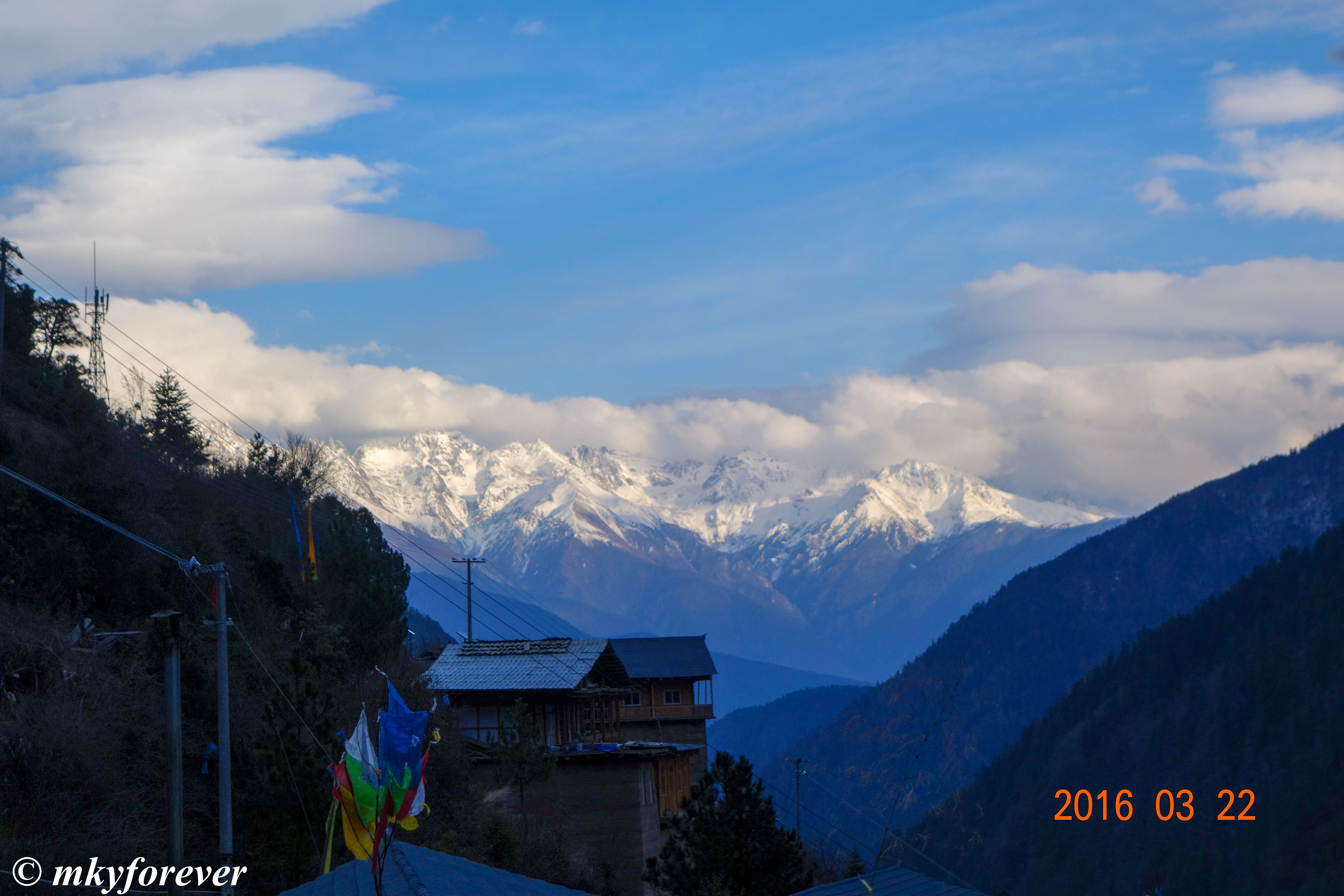 在村庄里四处转转,看看远处的蓝天、雪山,再看看不远处的雨崩下村。。。